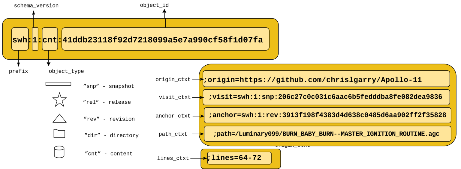 The SWHID is used to permanently identify specific software artifacts. Because the ID is based on the code’s content, it can uniquely reference a snapshot, a release, a commit, a directory, a file, or even a specific code fragment.