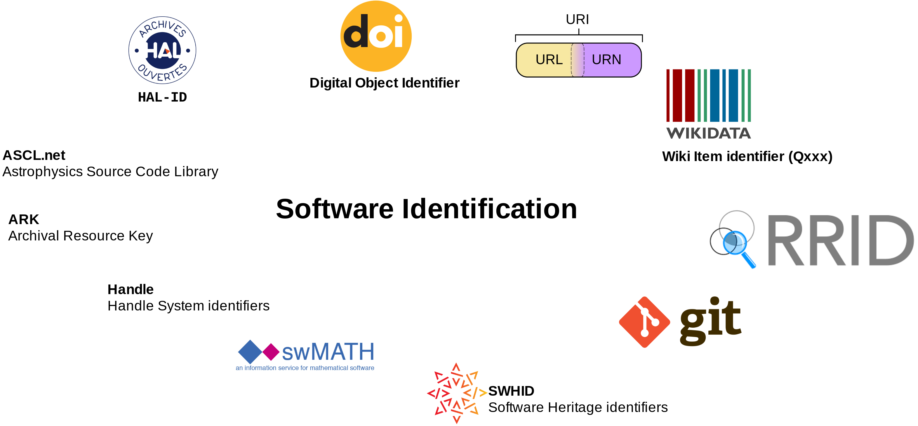 The joint RDA & FORCE11 Software Source Code Identification Working Group (SCID WG) has reviewed during the past year identification use cases and identifier schemes for software to analyze what identifier fits best for which software target (project, module, version, etc.), which are specified in the recently published first draft.