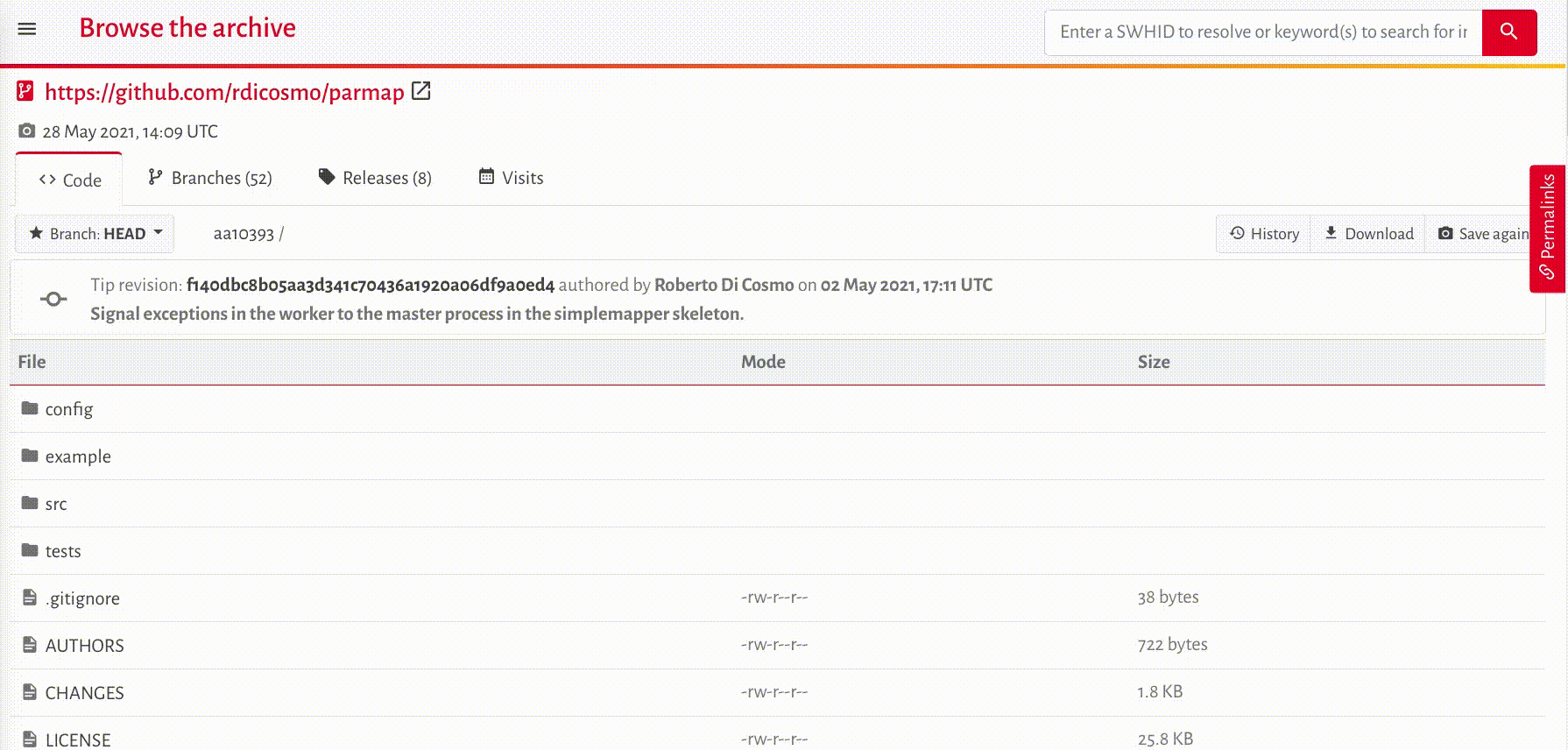 The “Permalinks” tab provides the SWHID for the content you are viewing. Here’s an example:
